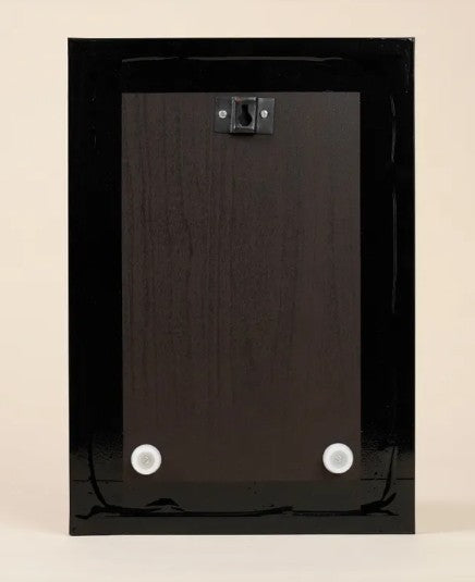 Enclosed in a sleek black wooden frame with a sturdy backrest for tabletop display or a wall-mount option, it seamlessly blends elegance with functionality.