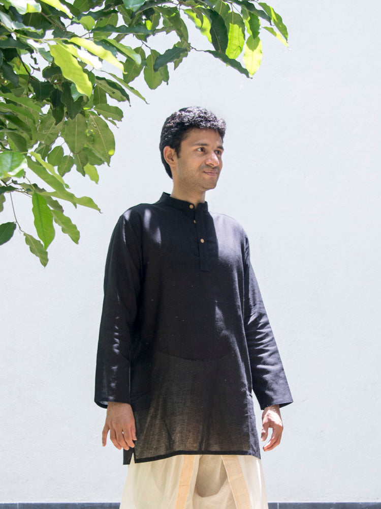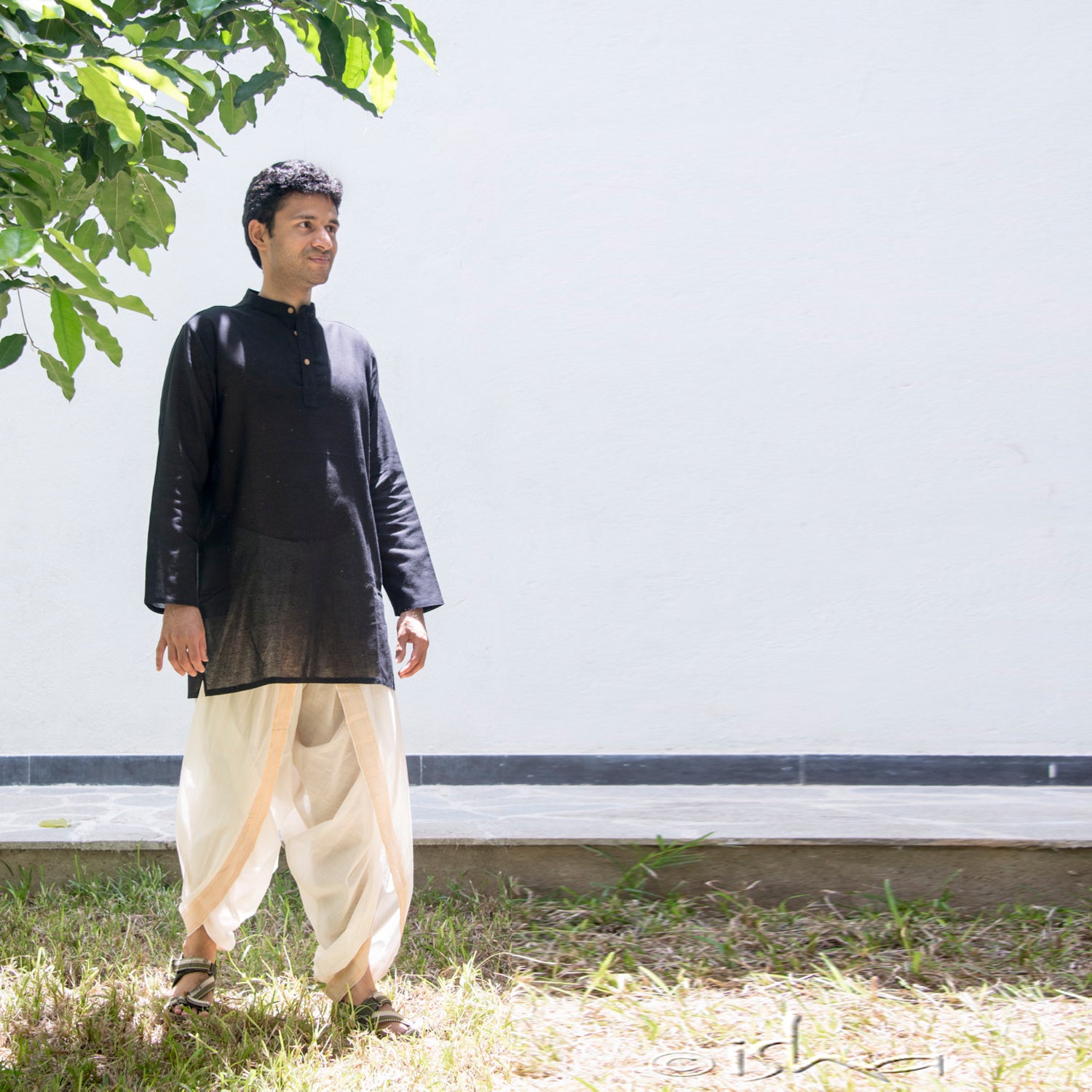 This black color kurta has been made from Hemp (which is one of the most environmentally friendly fibers in the world) and cotton. Hemp gives it a look of classic linen. This kurta is incredibly versatile and can be matched with trousers or dhoti. It has very elegant design and fitting which gives it a perfect ethnic look. It can be used as a comfortable yoga wear as it will allow your skin to breath during your practice. Apart from this, it will give a cool look at casual hang out with friends as well.