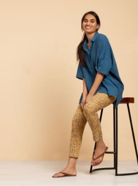 This stylish fitted cotton pants have a unique Kalamkari print which brings out your elegant yet artsy side. Kalamkari prints defines the art arena of Andhra Pradesh, from paintings and scrolls to sarees and temple adornments, it offers a fitting testament to a nation rife with colour and culture.
