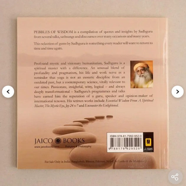Pebbles of Wisdom is a book comprised of the best of the best, thought-provoking quotes that Sadhguru has spoken over the years. These quotes come from talks, satsangs and other discourses where Sadhguru has been speaking to an audience of seekers. Each pebble of wisdom has the energy and insight to spark the reader to deeper levels of contemplation.