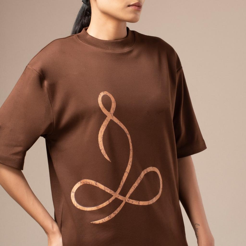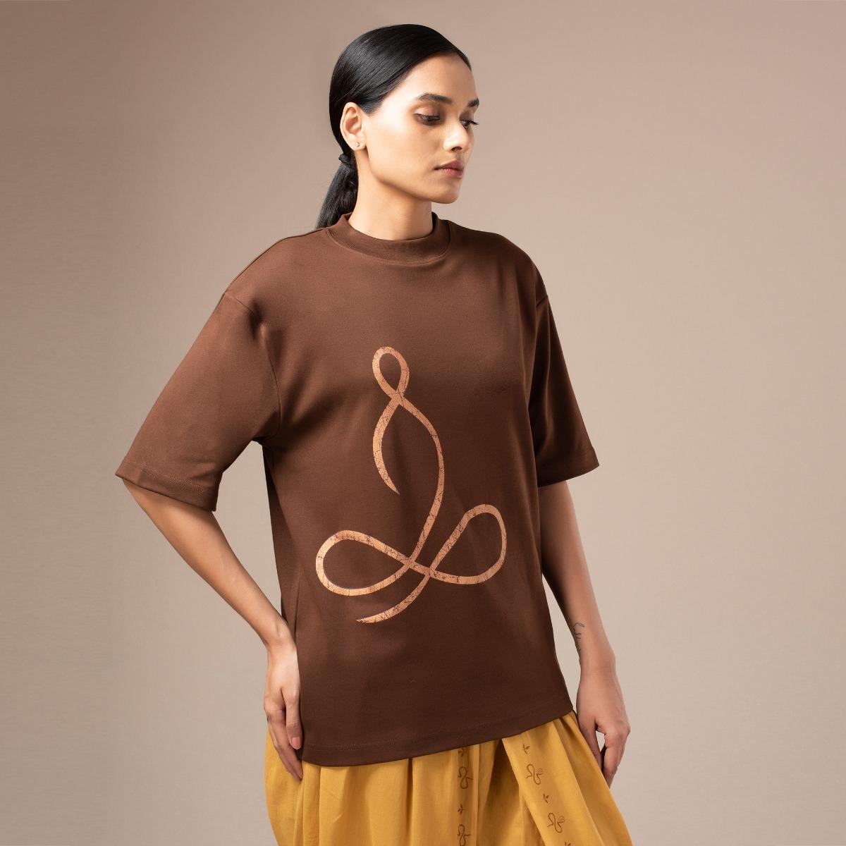 Gear up for Mahashivaratri with our brown unisex t-shirt. Crafted with 100% cotton interlock knit, it offers comfort and breathability. It comes in a trendy oversized silhouette, giving you a fashionable look. Featuring an artistic rendition of a sadhaka shaped like an infinity symbol, it showcases the perfect blend of style and symbolism. The two-layer print with pigment dyes and copper glitter adds a unique vintage texture that catches the eye.